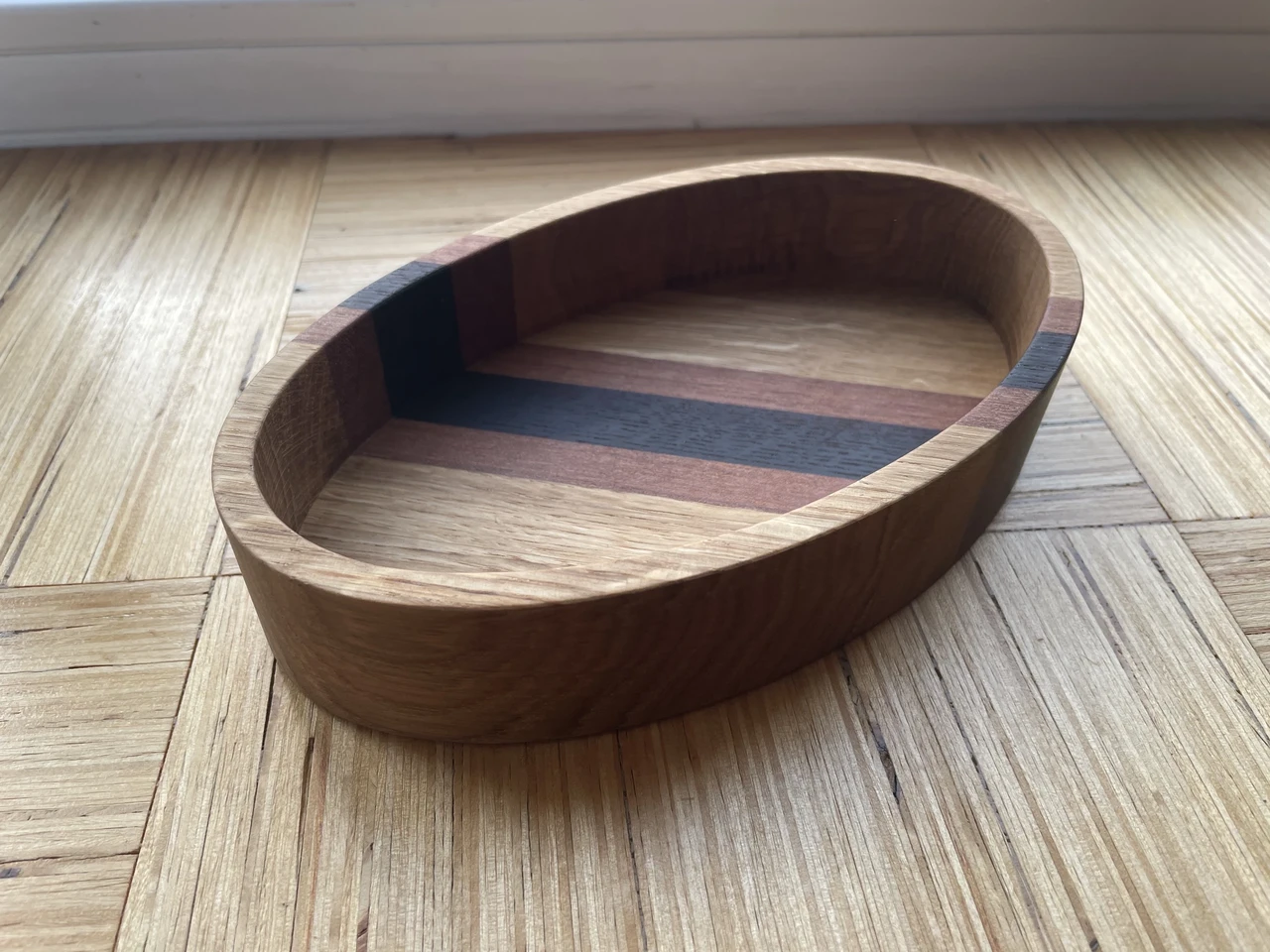 Tammepuust valmistatud karp pähklite, ehete vms väiksema pudi-padi tarvis. Tammepuule on lisatud varieeruvalt ka tükike vahtrat, mahagoni, või saart. Saab valida meelepärase kombinatsiooni. Viimistletud linaõli ja mesilasvahaga. Pikkus: 200 mm Laius: 100 mm Sügavus: 30 mm